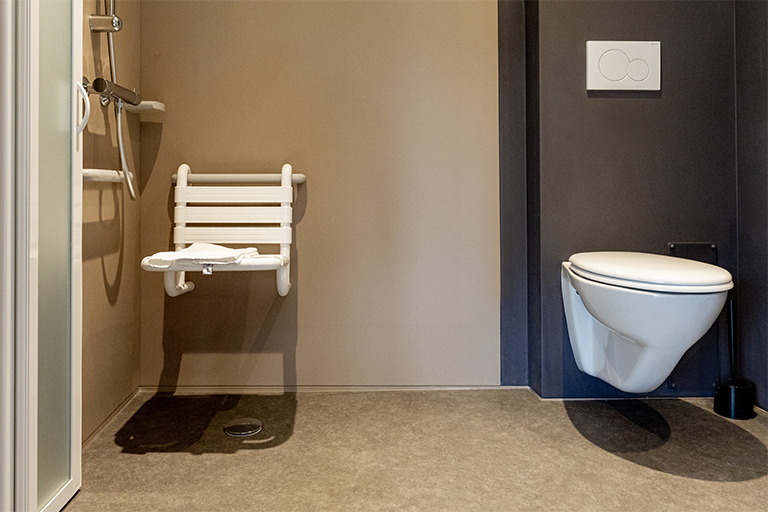 La salle de bain principale est équipée d’une cabine de douche homologuée, comprenant une douche, une vasque et des toilettes adaptées, conformes aux normes PMR (Personnes à mobilité réduite). La suite parentale, elle, est généreusement proportionnée, dotée d’une douche XL mesurant 100×80cm, garantissant un confort optimal. La deuxième chambre est tout aussi grande et propose avec facilité l’accès d’un fauteuil roulant à son bord.